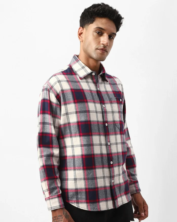 The Men’s Beige & Blue Checked Oversized Shirt is the ultimate layering essential. Wear it open over a graphic tee with baggy jeans and sneakers for that laid-back skater-boy aesthetic.